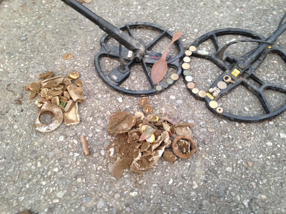 Nachfolgendes Bild zeigt die Suche mit 2 verschiedenen Detektoren. Hier tritt ein teurer Markenmetalldetektor (über 1000 €) gegen einen Einsteigermetalldetektor mit CORS Strike Powerspule an. Obwohl beide gleich lang im gleichen Suchgebiet gesucht haben, hat der Sondler mit dem Einsteigermetalldetektor und der CORS Spule deutlich mehr Münzen gefunden. Dieser Effekt wird von praktisch allen Sondengängern berichtet, die eine CORS Scout, Strike oder Cannon Spule verwenden.